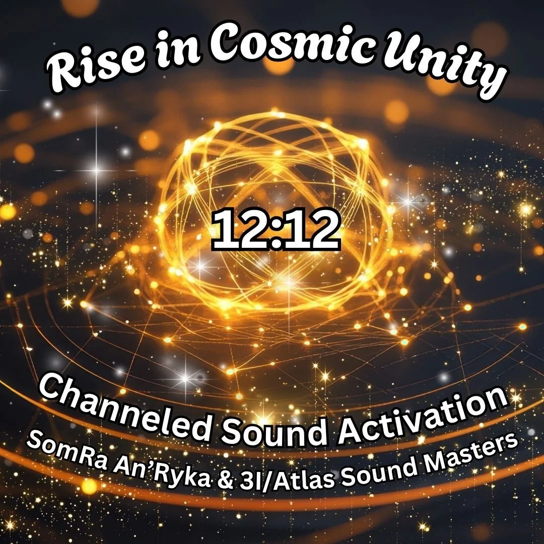 As 3I/Atlas reappears from behind the Sun during the 12:12 Gateway, the potential for personal evolution and vibration rises dramatically. SomRa An’Ryka will be channeling frequencies, songs, and Love-Light Languages with her higher-dimensional team The Trigalion Sound Masters plus The 3I/Atlas Sound Masters directly to you. Rise with us in Cosmic Unity!